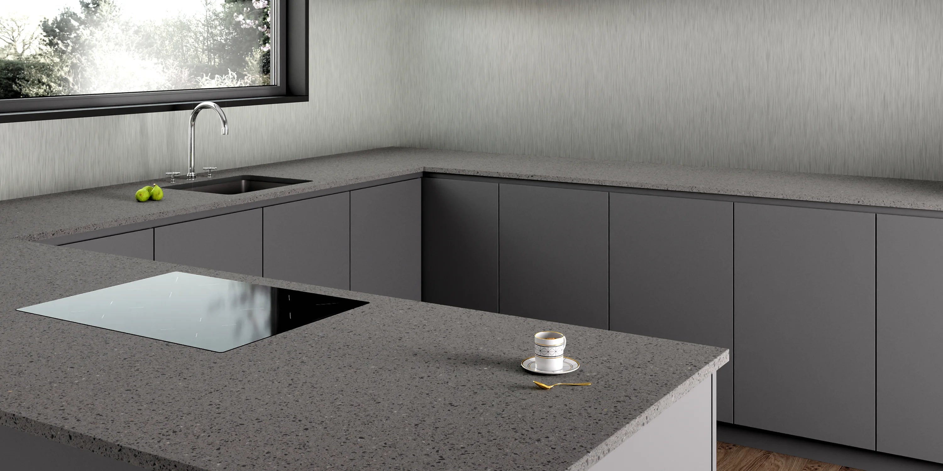 Quarzkomposit wird aus natürlichen Mineralien gefertigt. Es ist besonders widerstandsfähig gegen Stöße und bietet eine pflegeleichte, porenfreie Oberfläche in mattem oder poliertem Finish. Perfekt für luxuriöse Innenräume, kombiniert es die Ästhetik von Naturstein mit der glatten, feinen Haptik einer Glasoberfläche. Kombiniere stilvolle Arbeitsplatten und Rückwände aus Quarz für eine harmonische Einheit.